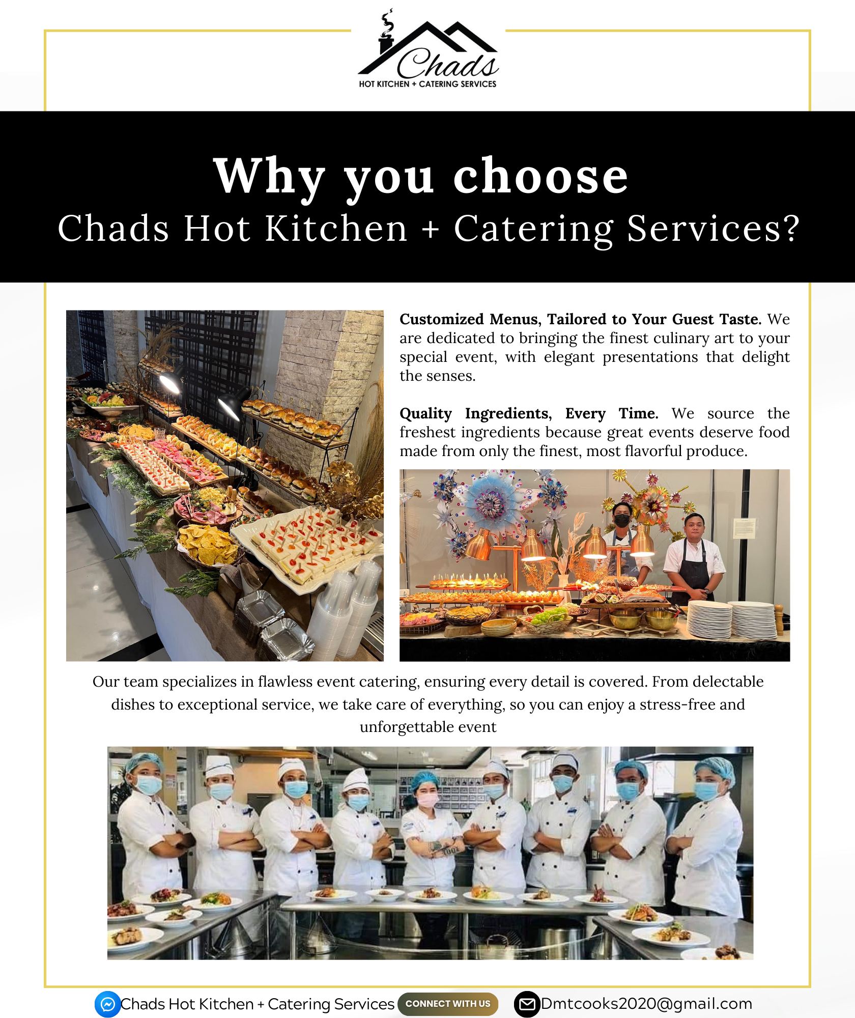 We also specialize in catering for all kinds of events, including birthdays, weddings, corporate functions, and more. Our team works closely with clients to create customized menus that suit every taste and occasion. At Chad’s Hot Kitchen, quality and consistency are our top priorities, ensuring that every bite is as satisfying as the first. We pride ourselves on friendly service, timely delivery, and making every dining experience enjoyable.